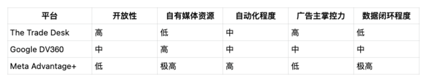总的来说,The Trade Desk 代表的是纯开放——为广告主赋能、提高透明度和可控性;Google DV360 是“中间地带”——既利用自身资源优势,又维持一定的开放性;而Meta从未真正参与“中间人”这件事,它从头到尾都在构建闭环生态——封闭的数据、封闭的流量、封闭的算法优化。