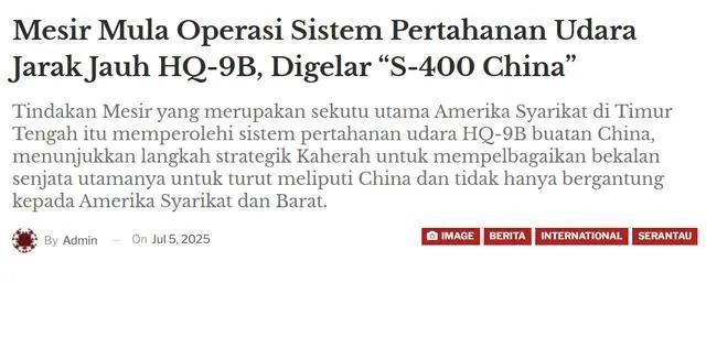 7 月 5 日,美国" Army Recognition "、俄罗斯" Top War "、亚洲" Defence Security Asia "等网站,集体报道了埃及正式列装红旗 -9BE 的消息。这款重量级武器的交付,不仅意味着双方关系的根本转变,也是未来歼 -10CE、歼 -35E 出口的希望。