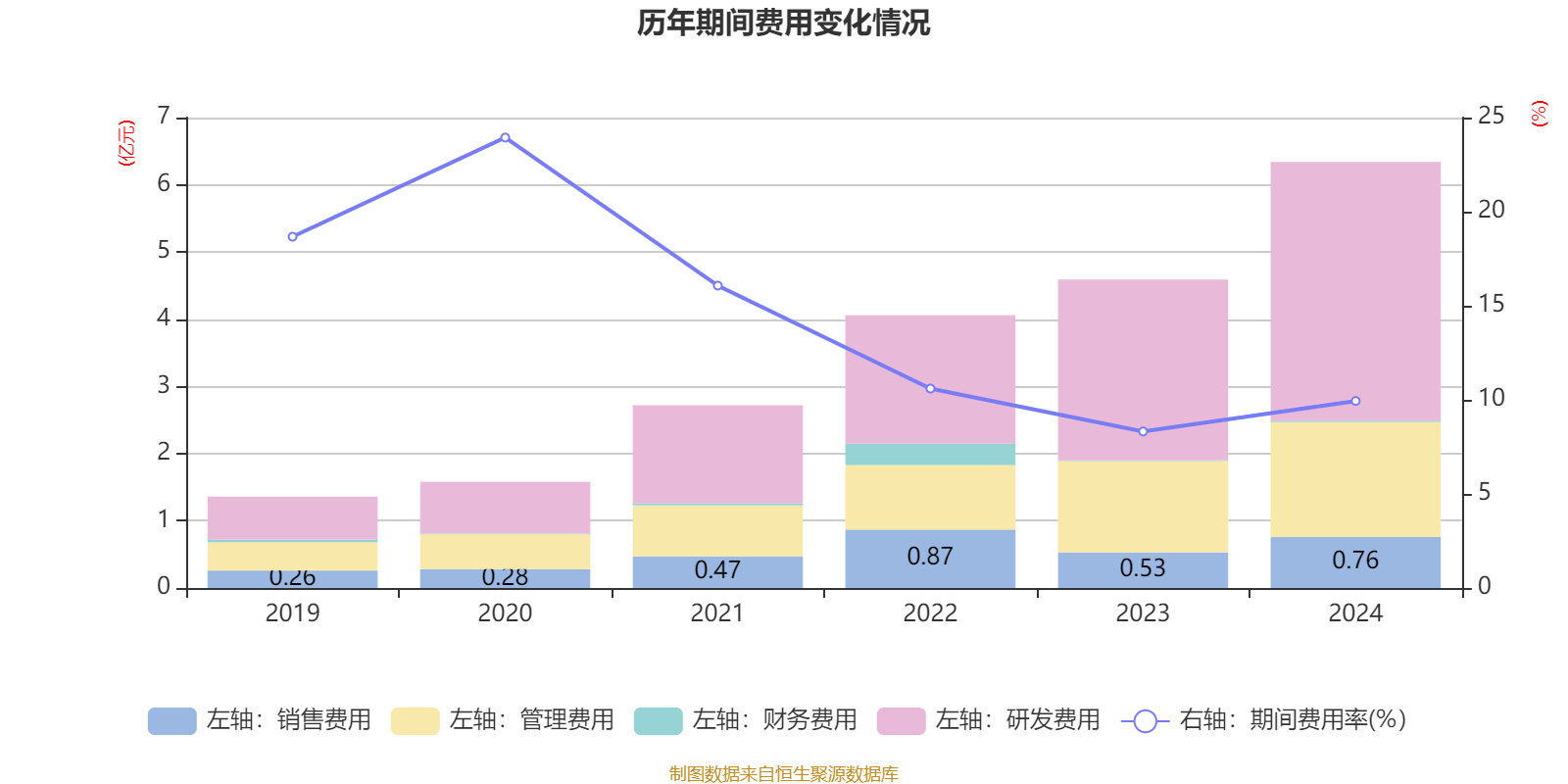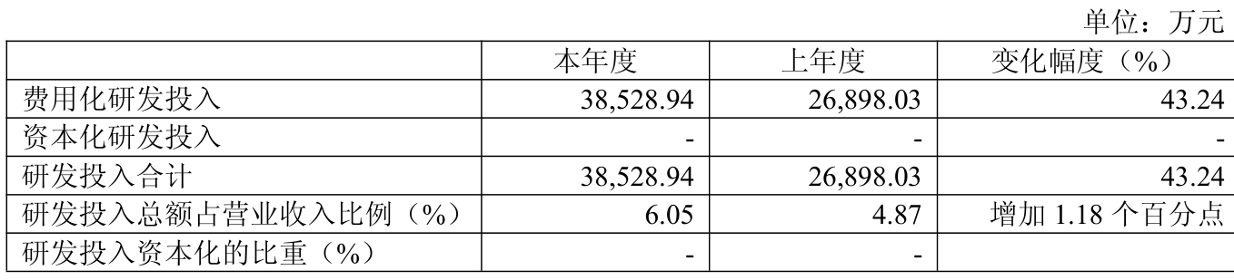 2024年全年,公司研发投入金额为3.85亿元,同比增长43.24%;研发投入占营业收入比例为6.05%,相比上年同期上升1.18个百分点。