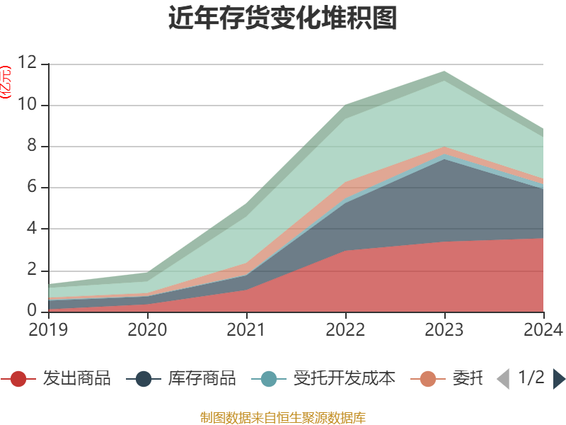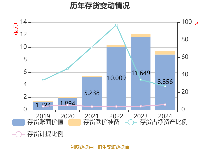 从存货变动来看,截至2024年末,公司存货账面价值为8.86亿元,占净资产的27.08%,较上年末减少2.79亿元。其中,存货跌价准备为5631.34万元,计提比例为5.98%。