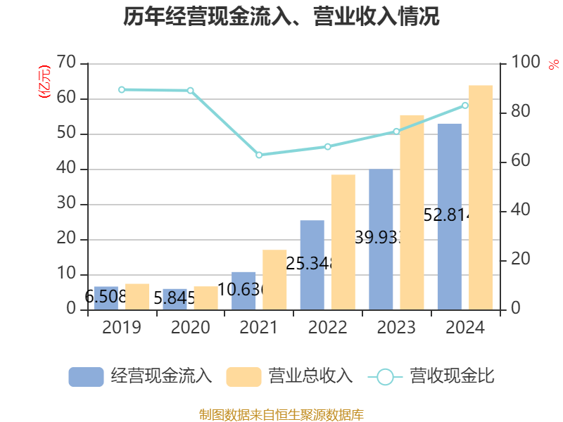 中证智能财讯威迈斯(688612)4月26日披露2024年年度报告。2024年,公司实现营业总收入63.72亿元,同比增长15.39%;归母净利润4亿元,同比下降20.34%;扣非净利润3.55亿元,同比下降25.62%;经营活动产生的现金流量净额为10.27亿元,同比增长41.24%;报告期内,威迈斯基本每股收益为0.95元,加权平均净资产收益率为11.75%。公司2024年度分配预案为:拟向全体股东每10股派现3.59元(含税)。