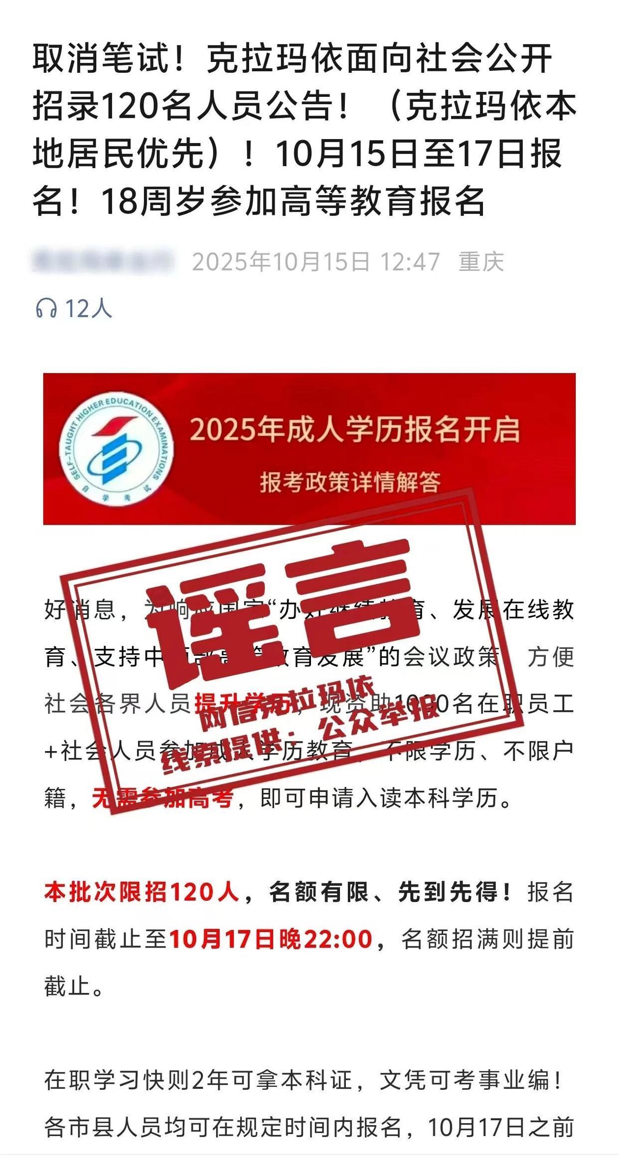 近日,某微信公众号发布消息称“克拉玛依面向社会公开招录120名人员,本地居民优先”“成人学历提升可获全额奖学金”等,引发社会关注。