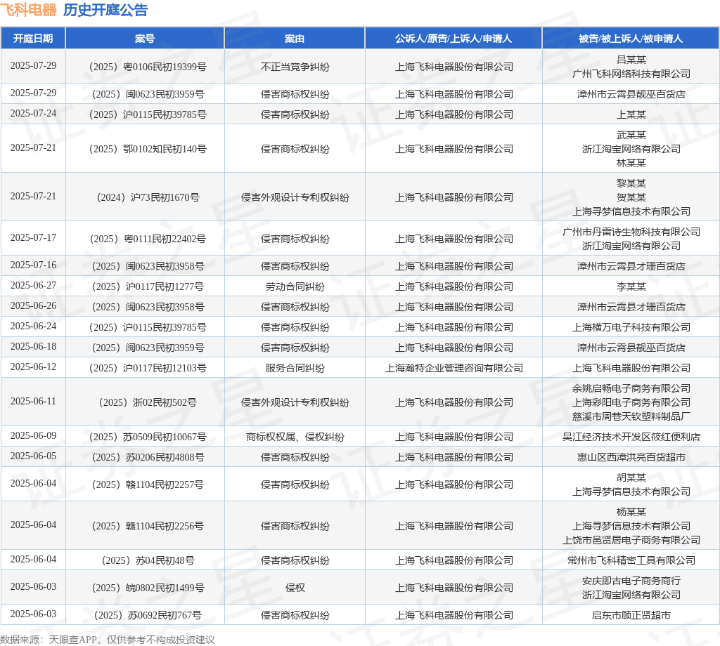 案号:(2025)闽0623民初3959号审理法院:漳浦县人民法院案由:侵害商标权纠纷当事人信息: 原告/上诉人:上海飞科电器股份有限公司 被告/被上诉人:漳州市云霄县靓巫百货店开庭日期:2025年6月18日根据统计,近一年内以上海飞科电器股份有限公司为当事人的历史开庭公告有345则,其中案由为“侵害商标权纠纷”的公告以273则居首,其次为“不正当竞争纠纷”有18则,“商标权权属、侵权纠纷”有11则。历史开庭公告(前20条)如下: