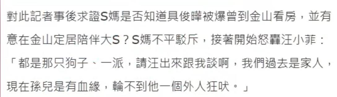 S妈和汪小菲的恩怨先暂时放在一边,大家还在为她突然炮轰前女婿感到云里雾里时,S妈转头又肯定了具俊晔,可别忘了,在此之前,台媒可是刚刚曝光了具俊晔有意在大S墓地旁买房,但暂时迫于费用问题没有立即下手。