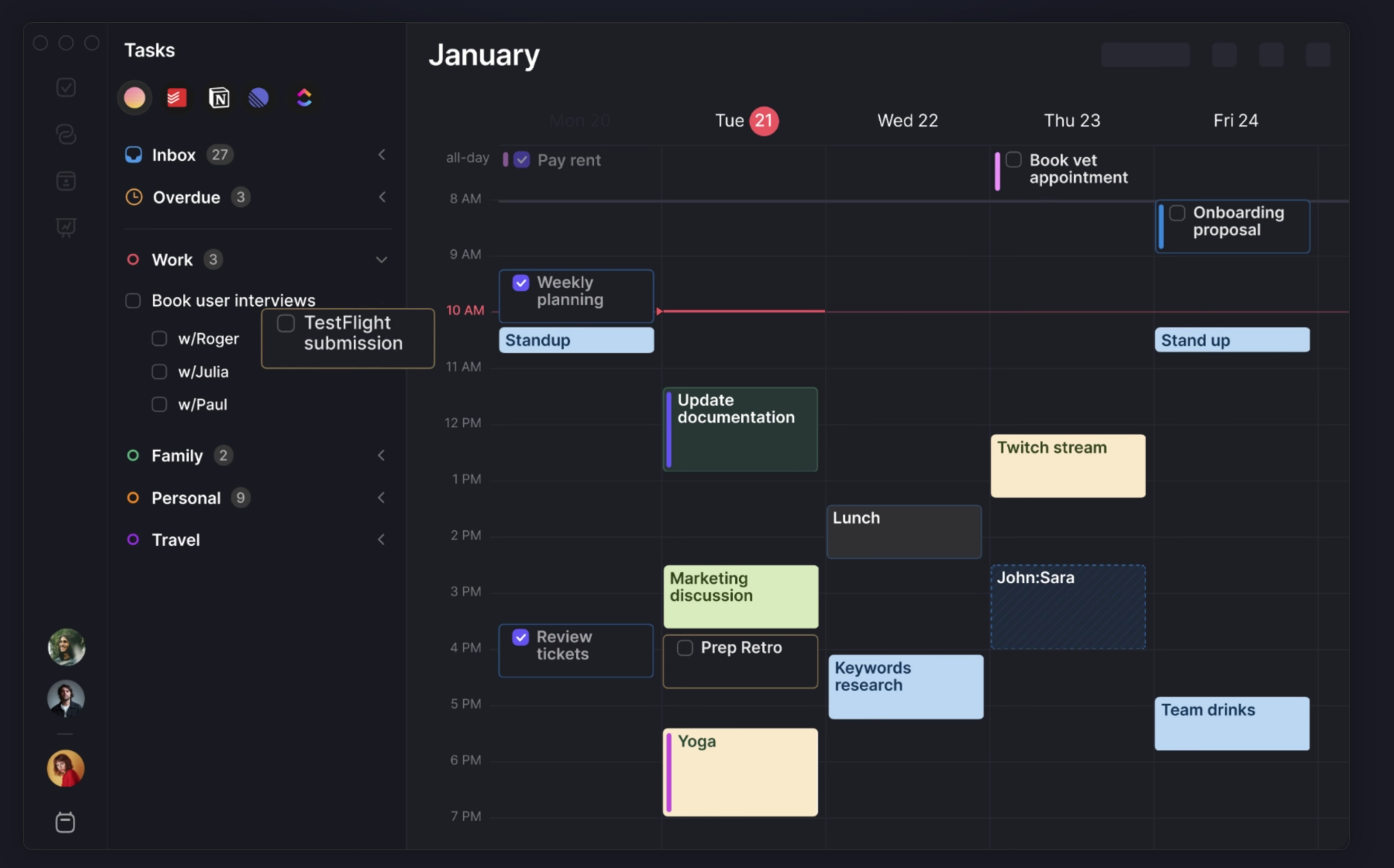 Morgen的软件能够集成各类应用,进行任务集中管理。Morgen可将Google、Outlook、Apple、Fastmail 等日历工具整合到一个平台上,提供用户所需的各类功能,无需来回切换,避免重复预订、错过预约与超负荷工作等情况的产生。软件还可直接从Notion、ClickUp、Linear 或 Todoist 等应用程序对新的一周展开规划,使用待办事项列表、项目管理与PKM等工具进行任务筛选,集中管理任务。软件支持MacOS、Windows、Linux、iOS 和 Android 等各类平台。