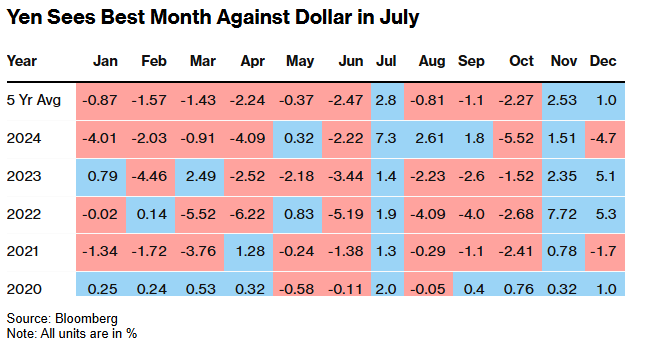 外汇分析师将过去几年日元在7月的优异表现归因于多种因素,包括日本央行的政策变化、8月夏季假期前的头寸调整,以及出口商将海外收入兑换回日元以支付股息等。其中一些因素本月可能会再次发挥作用。