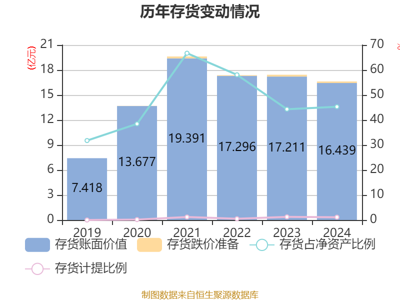从存货变动来看,截至2024年末,公司存货账面价值为16.44亿元,占净资产的45.31%,较上年末减少7714.53万元。其中鼎冠策略资,存货跌价准备为1868.92万元,计提比例为1.12%。