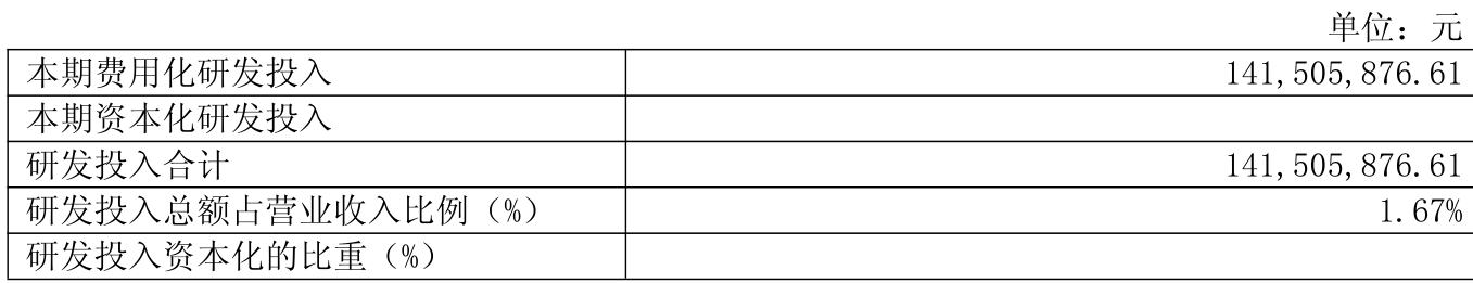 2024年全年,公司研发投入金额为1.42亿元,同比增长22.35%;研发投入占营业收入比例为1.67%,相比上年同期上升0.22个百分点。此外,公司全年研发投入资本化率为0%。