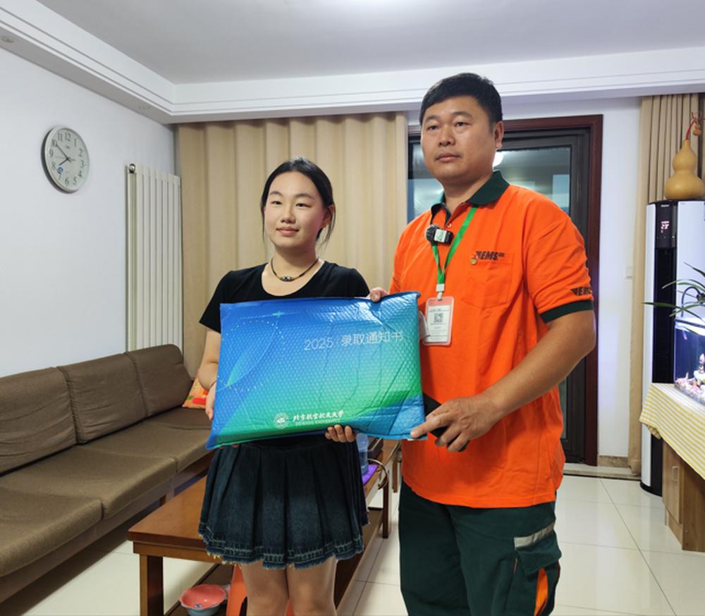 7月12日晚上7点半,中国邮政速递济南市工北第一揽投部投递员蔡宝将来自北京航空航天大学的录取通知书送达考生杨烁冉手中钱程速配,并向她表示祝贺。这是济南市2025年首封高考录取通知书。