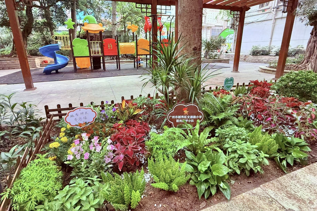 在美学“扮靓”街区方面,校外辅导员会同少先队员,通过实地勘测、居民访谈与微环境分析,根据不同的街区和楼道的空间结构与光照条件,“量身定制”景观美学方案。重点引入岭南文化元素,带领队员体验植物拓印技艺、学习制作非遗岭南压花画、装饰美化楼道墙面。场景“具象”理念。高校和少先队立足生活场景创设“行走的生态文明课堂”,推动生态理念转化为具象实践。如越秀区少年宫趣味科学实验班打造小药圃,组织队员种植薄荷、藿香等中草药,在培育过程中深化植物认知;文德路小学忠德中队阳光追梦林长小队实施大塘街金鱼塘广场改造工程,系统完成场地测绘、土壤改良、方案设计及苗木采购工作,建成兼具可食作物栽培与中草药科普功能的实践园区。