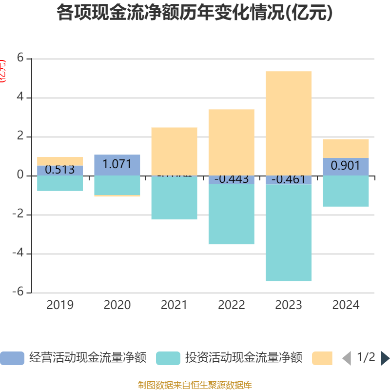 截至2024年,公司经营活动现金流净额为9006.79万元,同比增加1.36亿元;筹资活动现金流净额9589.73万元,同比减少4.39亿元;投资活动现金流净额-1.6亿元,上年同期为-4.95亿元。
