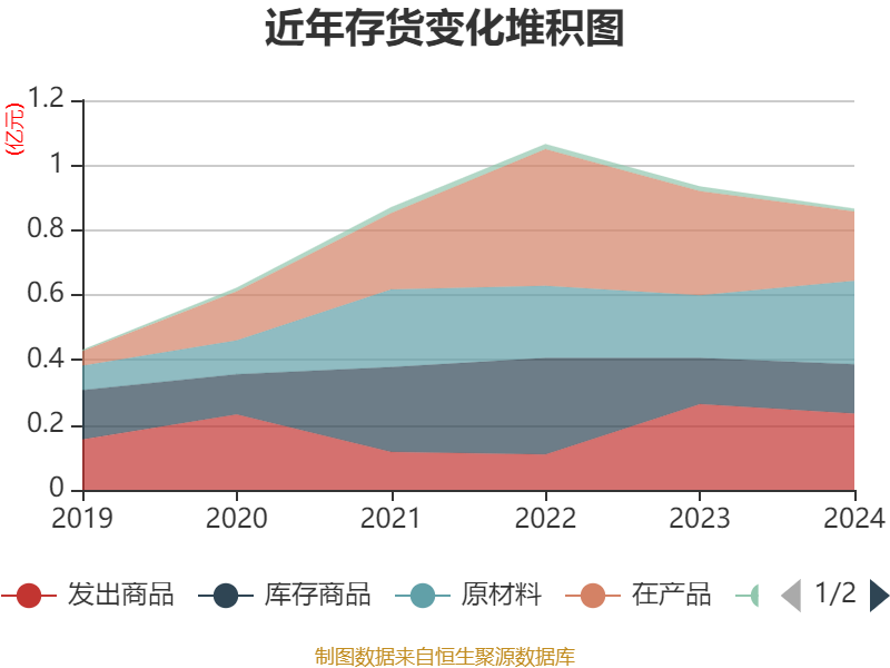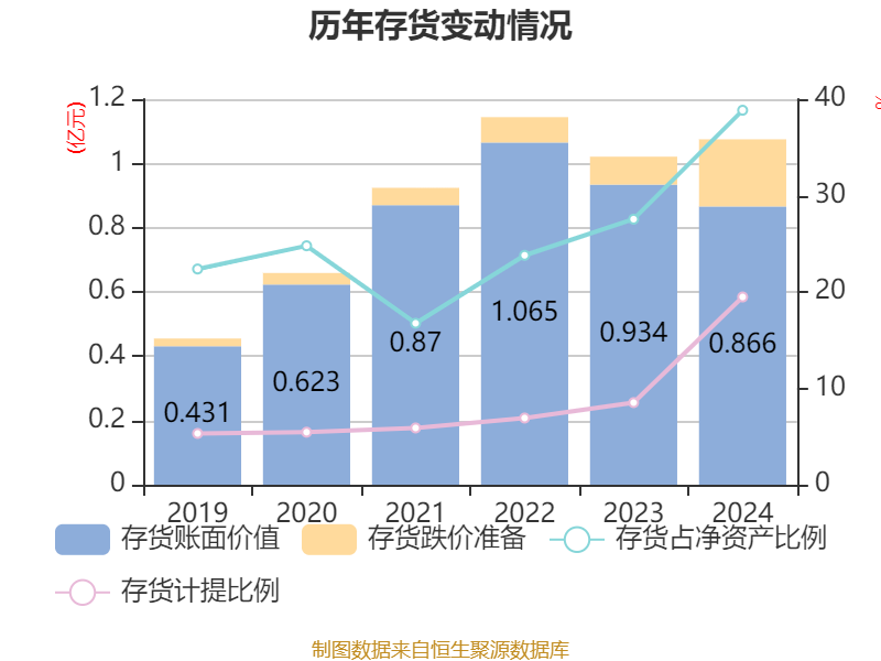 从存货变动来看,截至2024年末,公司存货账面价值为8661.18万元,占净资产的38.85%,较上年末减少681.16万元。其中配资台,存货跌价准备为2094.74万元,计提比例为19.48%。