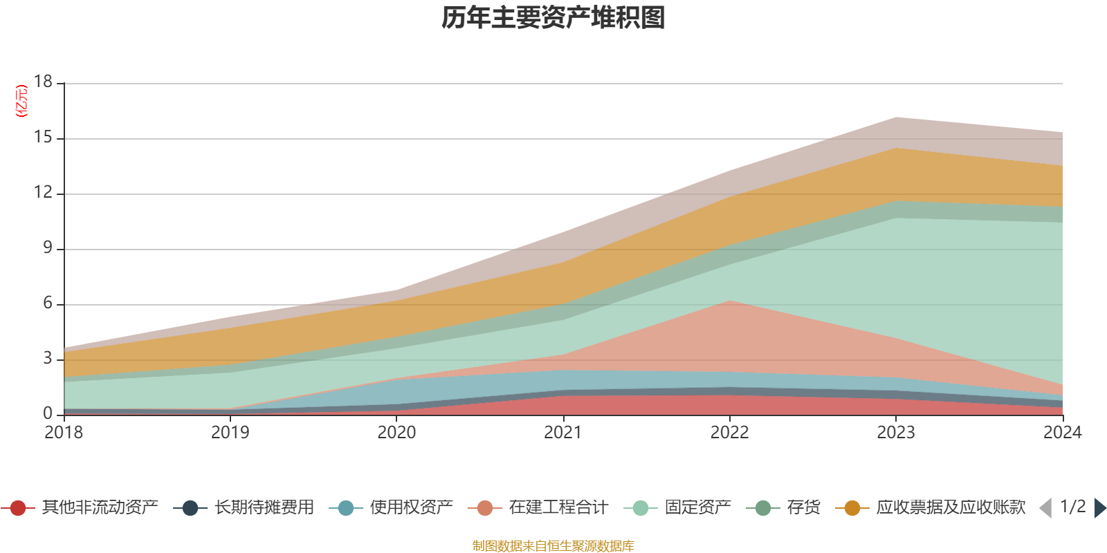 资产重大变化方面,截至2024年末,公司固定资产较上年末增加34.83%,占公司总资产比重上升17.02个百分点;在建工程合计较上年末减少73.28%,占公司总资产比重下降9.46个百分点;其他流动资产较上年末减少78.55%,占公司总资产比重下降3.33个百分点;应收票据及应收账款较上年末减少22.68%,占公司总资产比重下降3.29个百分点。