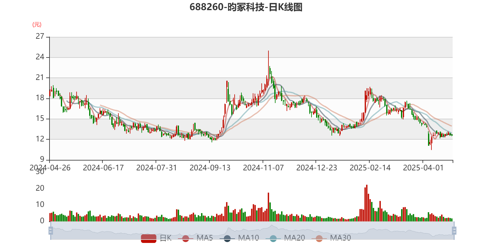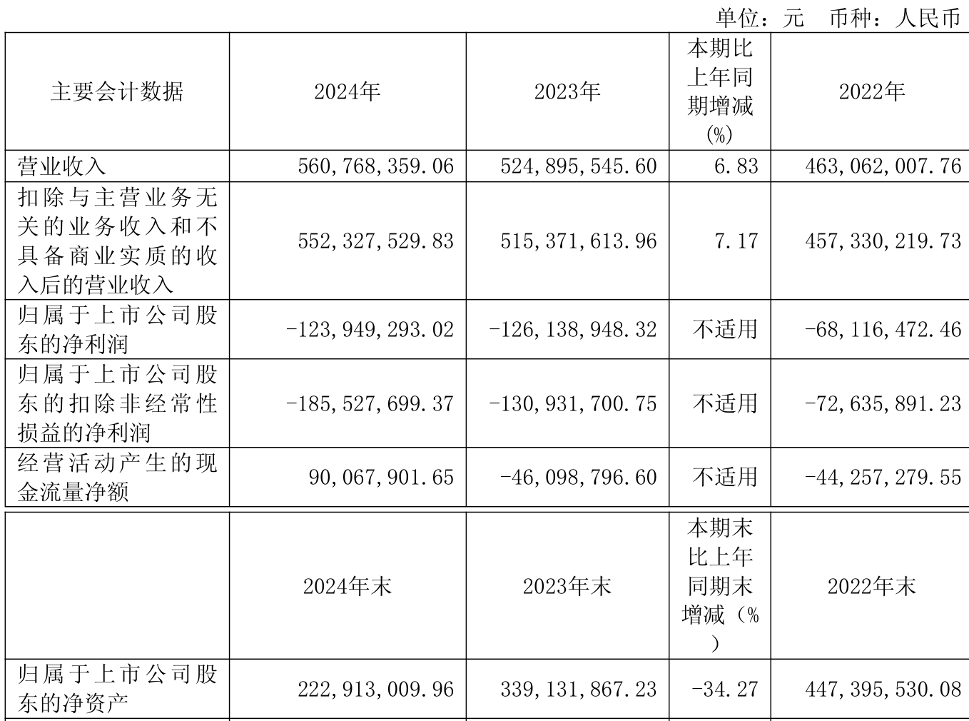 中证智能财讯昀冢科技(688260)4月26日披露2024年年度报告。2024年,公司实现营业总收入5.61亿元,同比增长6.83%;归母净利润亏损1.24亿元,上年同期亏损1.26亿元;扣非净利润亏损1.86亿元,上年同期亏损1.31亿元;经营活动产生的现金流量净额为9006.79万元,上年同期为-4609.88万元;报告期内,昀冢科技基本每股收益为-1.0329元,加权平均净资产收益率为-44.20%。